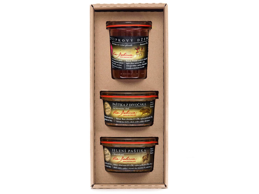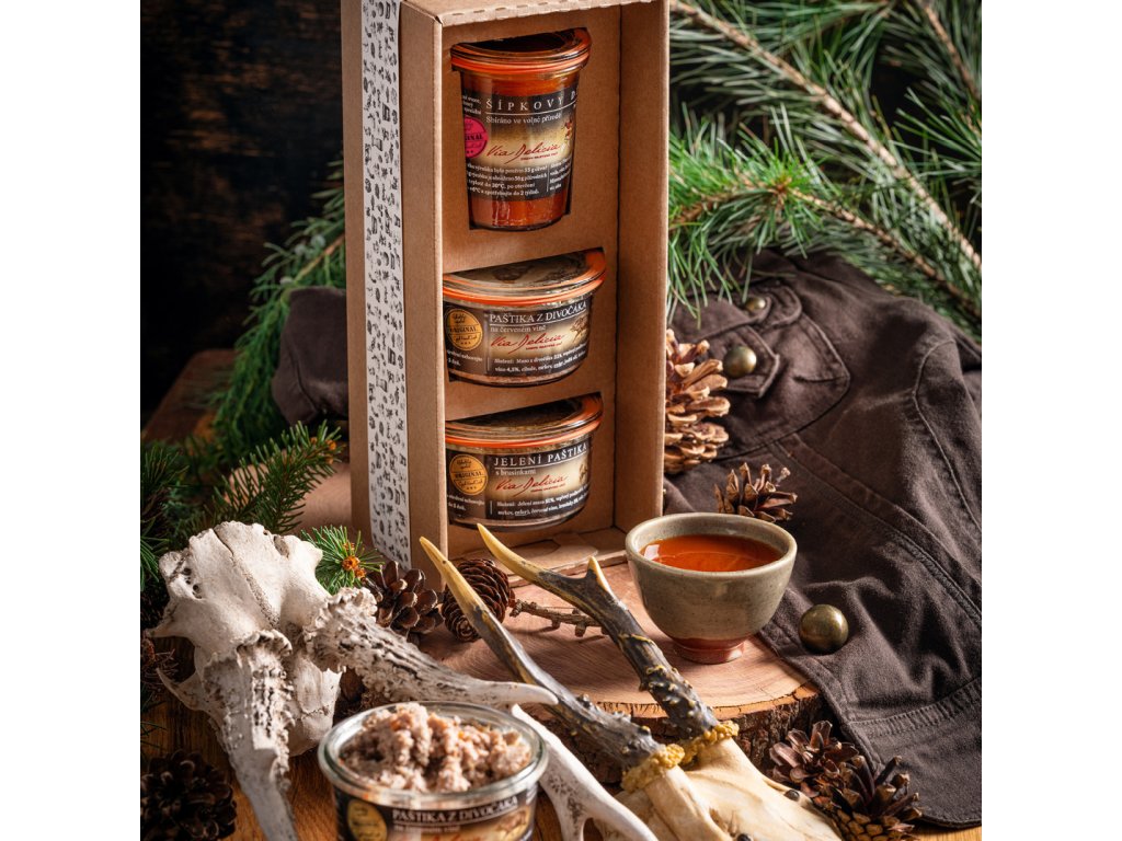 Složení: šípkový džem 175 g (dužnina z planých šípků (Rosa canina), voda, cukr, želírující látka - pektin), paštika z divočáka na červeném víně 130 g (maso z divočáka (51%), vepřové maso, červené víno (4,5%), cibule, mrkev, celer, sůl, koření), jelení paštika s brusinkami 130 g (jelení maso 51%, vepřový podbradek, zelenina (cibule, mrkev, celer), červené víno, brusinky 3%, cukr, koření, jedlá sůl)