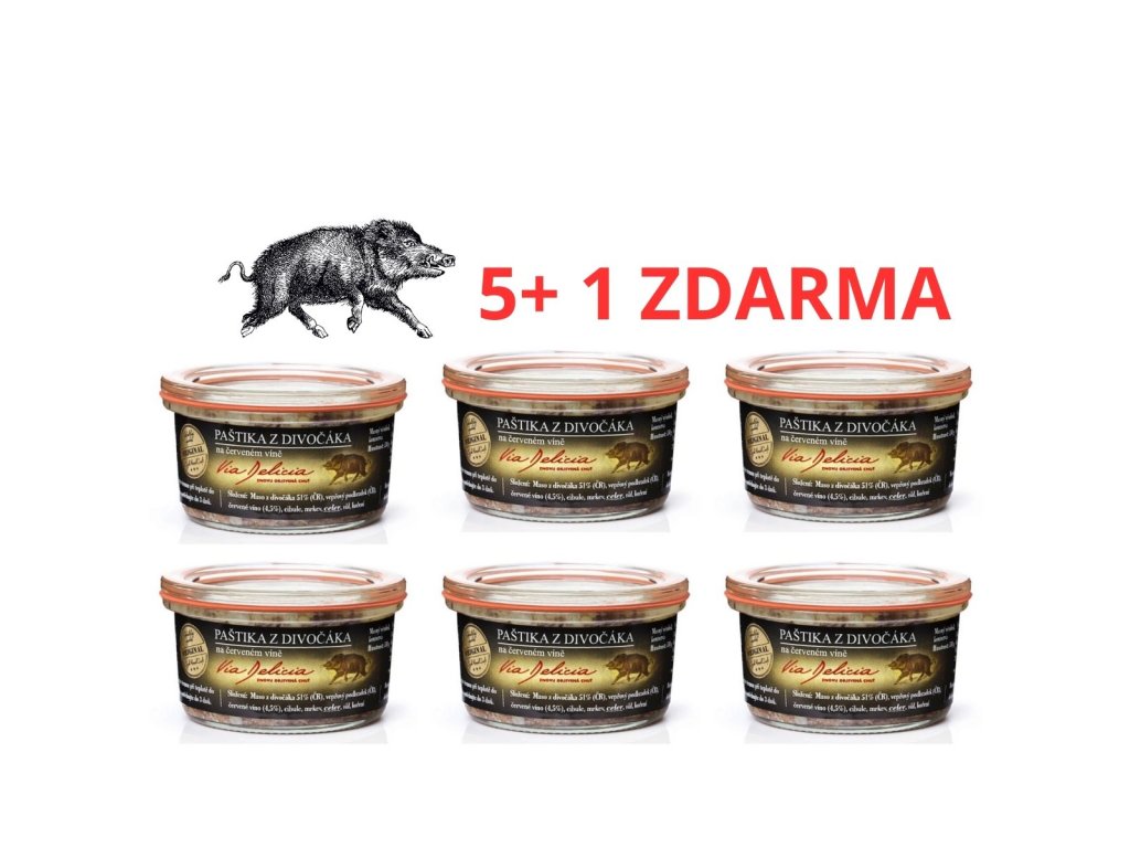 Paštiku vyrábíme ručně v malých šaržích z kvalitního masa z divočáka. Přirozeně výrazná chuť zvěřiny je zjemněna červeným vínem, které dodává paštice hloubku, kulatost a lehce nasládlý dozvuk. Díky pečlivému zpracování a šetrné sterilaci je paštika dlouhodobě trvanlivá – až 18 měsíců při skladování do 30 °C, a to bez nutnosti uchovávání v lednici.