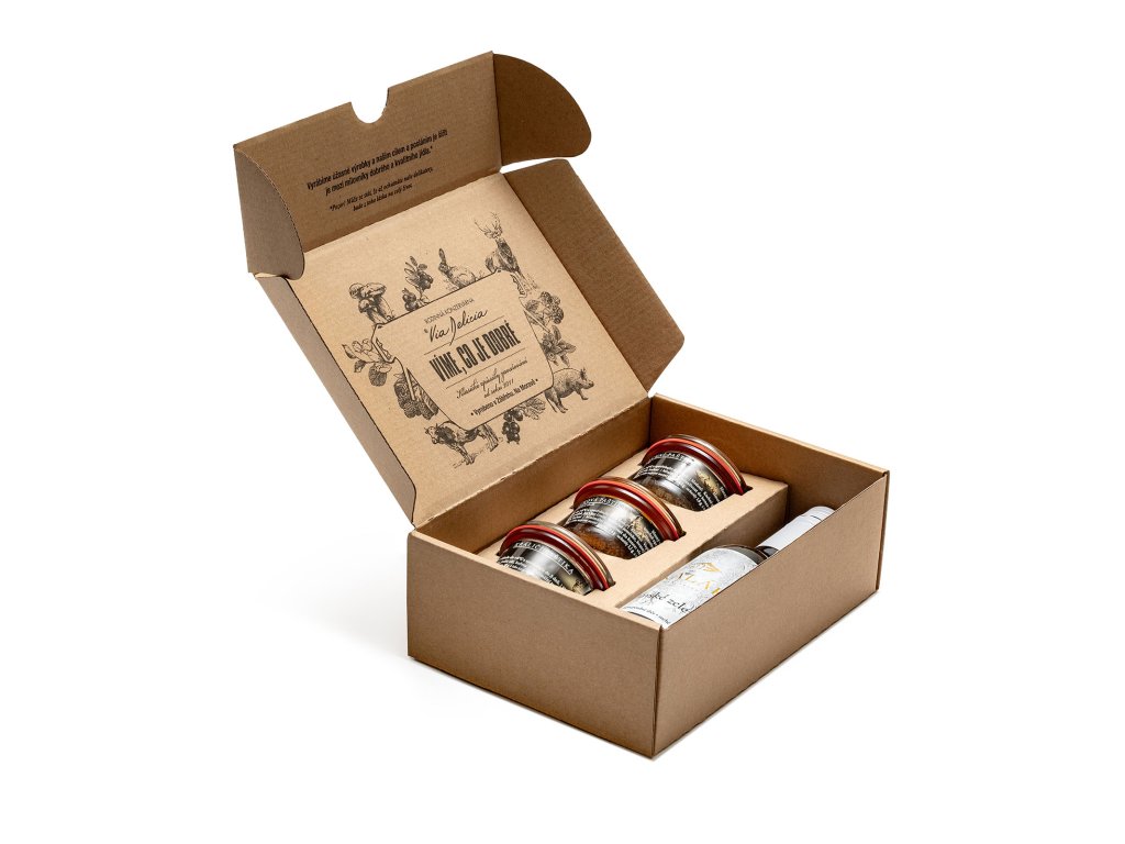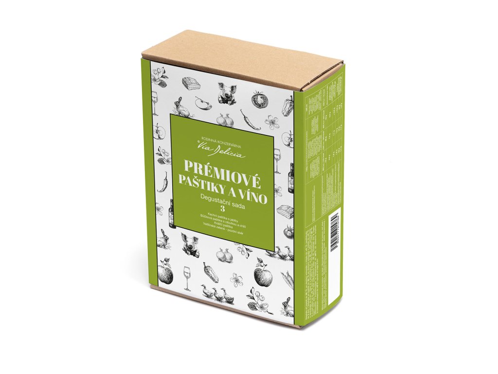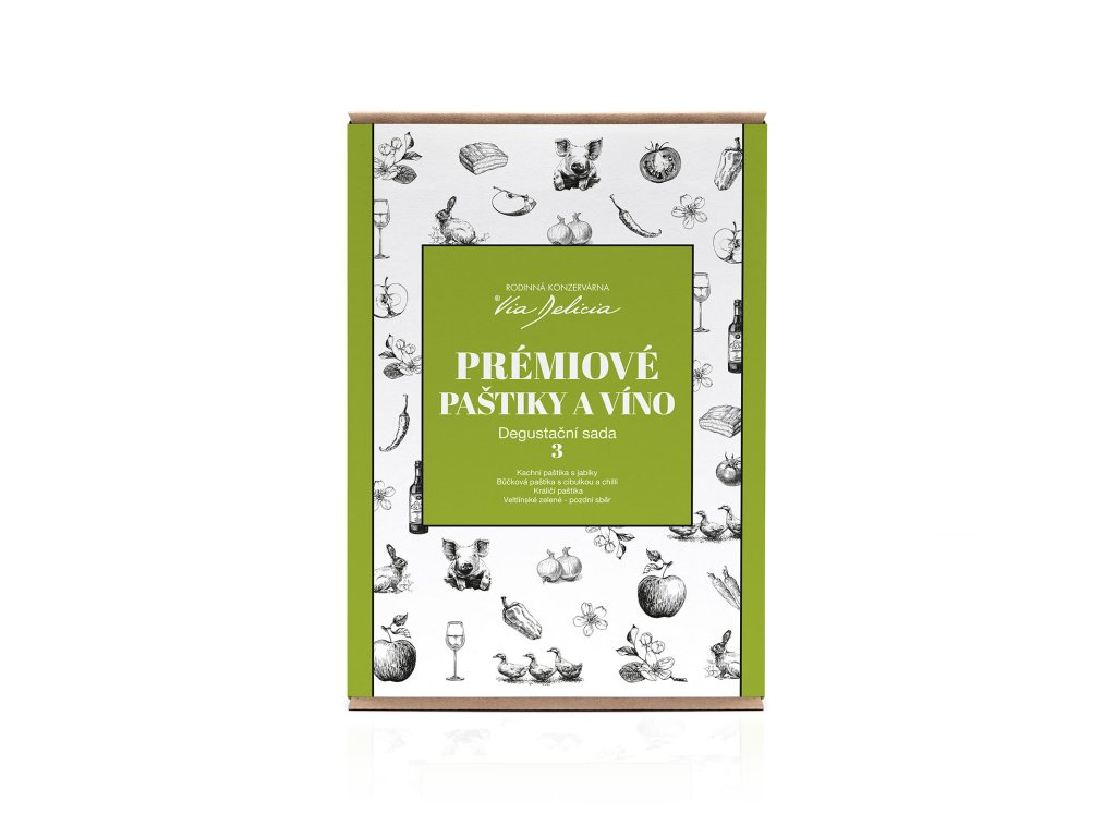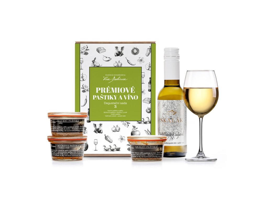 Složení: kachní paštika s jablky 50 g (kachní maso 60%, kachní játra 17%, vepřové maso, jablka, cibule, jedlá sůl, koření), králičí paštika 50 g (králičí maso 51%, vepřové maso, zelenina (mrkev, celer, cibule), sůl, koření), bůčková paštika s cibulkou a chilli 50g (vepřový bůček 57%, vepřový podbradek, cibule 10%, paprika, rajčatový protlak, hořčice (voda, hořčičné semínko, kvasný ocet lihový, cukr, jedlá sůl, koření), jedlá sůl, chilli papričky 0,2%, koření), Veltlínské zelené 250 ml z vinařství Skalák