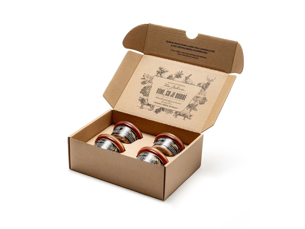 Složení: dančí paštika s divokým kořením 50g (maso z daňka 51%, vepřový podbradek, cibule, červené víno, uzené maso (vepřové maso, sůl, kouř), celer, mrkev, jedlá sůl, koření 0,4%, sušené pravé hřiby 0,2%), játrová paštika s restovanou cibulkou 50g (vepřové maso, vepřová játra 30%, cibule 18%, uzené maso bez rychlosoli (vepřové maso, kouř), jedlá sůl, koření), paštika z grilovaného kuřátka 50g (kuřecí maso 51%, vepřový podbradek, cibule, mrkev, celer, bílé víno, jedlá sůl, grilovací koření), bůčková paštika s cibulkou a chilli 50g (vepřový bůček 57%, vepřový podbradek, cibule 10%, paprika, rajčatový protlak, hořčice (voda, hořčičné semínko, kvasný ocet lihový, cukr, jedlá sůl, koření), jedlá sůl, chilli papričky 0,2%, koření)