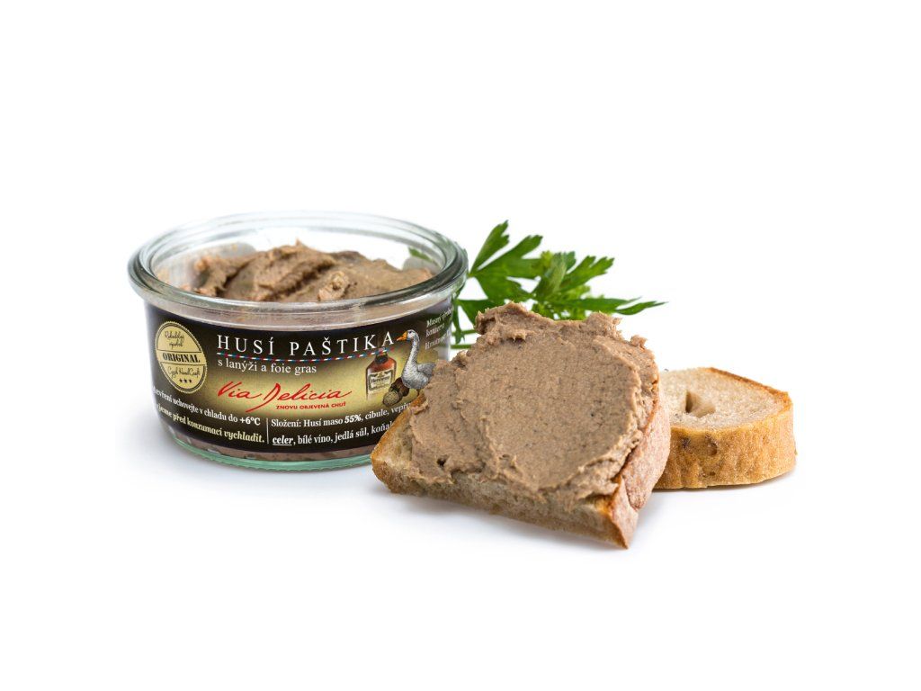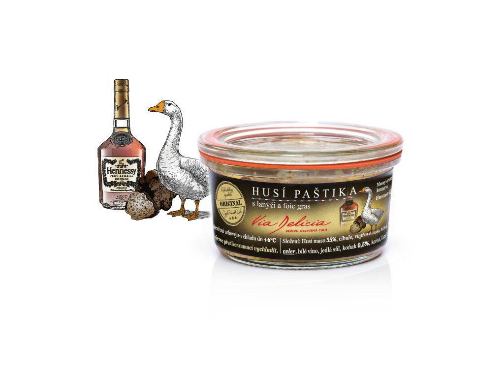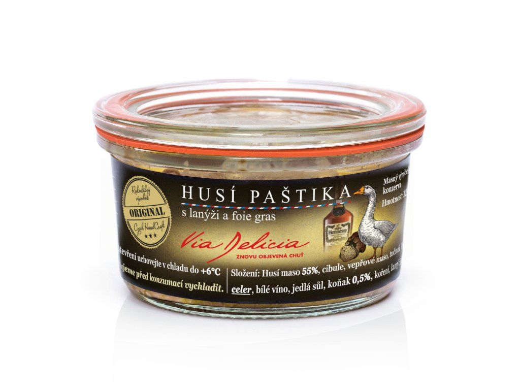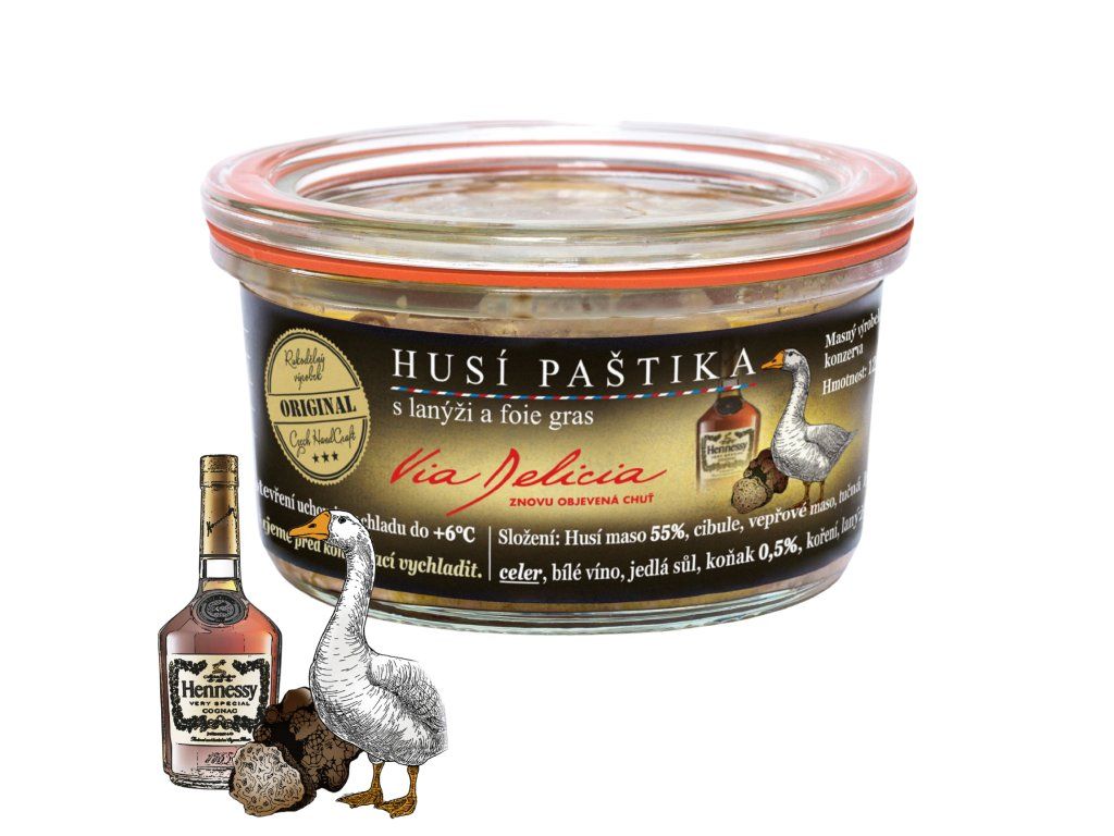 Prémiová husacia paštéta pre náročných gurmánov. Delikátna kombinácia jemného husacieho mäsa, foie gras (husacej pečene), čiernych lanyžoch, koňaku, bieleho vína, koreňovej zeleniny a vybraného korenia vytvára výnimočnú gurmánsku paštétu, ktorá sa hodí na slávnostné príležitosti aj ako luxusný darček.