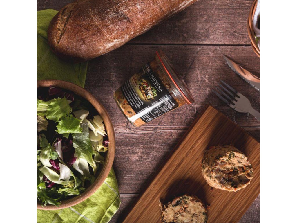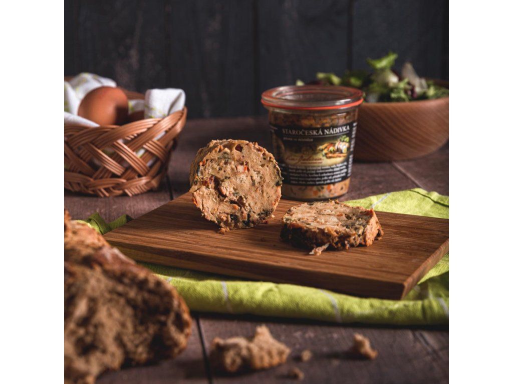 Plnku sme upiekli priamo v poháriku, a tak vznikla takáto slaná bábovka. Dá sa tiež ľahko vyklopiť a nakrájať na kolieska ako obrúsková knedľa. Plnka je výborná za studena aj za tepla (k listovému šalátu, s nakladanou uhorkou, ale aj ako príloha k pečenému mäsu alebo ku grilovanému kuriatku). Plnku môžete ohriať priamo v poháriku v rúre na 180 °C / 10 minút, alebo v mikrovlnke 1,5 minúty na plný výkon.