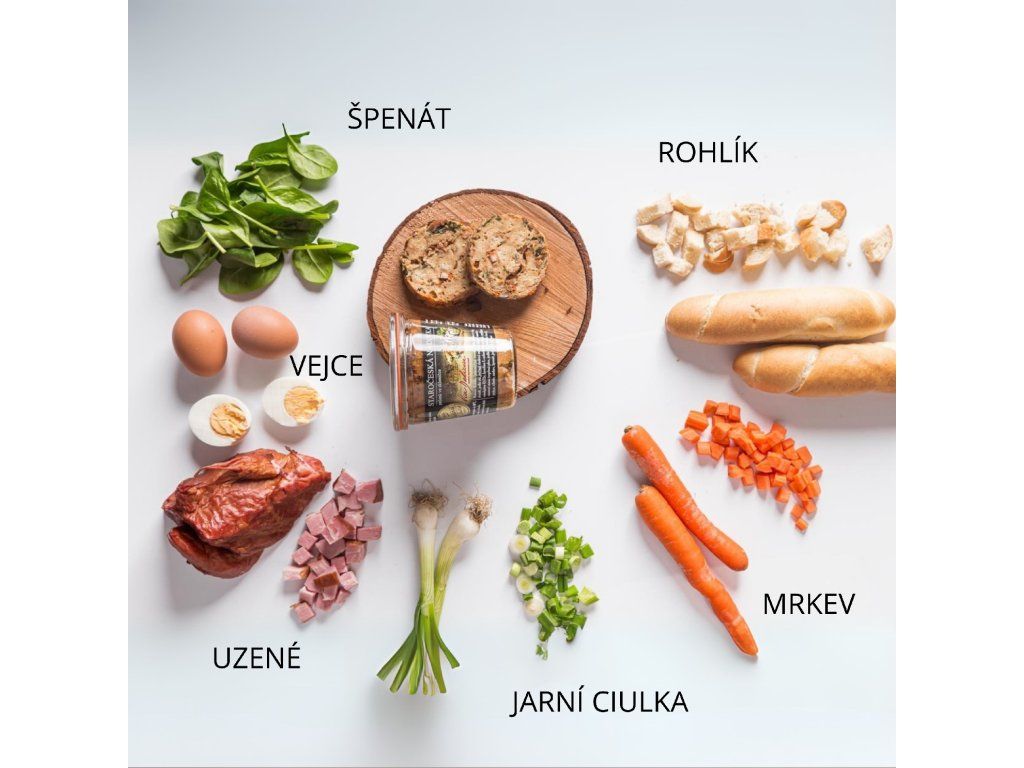 Zloženie: rožky, mlieko, údené bravčové mäso, vajcia, cibuľa, mrkva, špenát, jedlá soľ, korenie