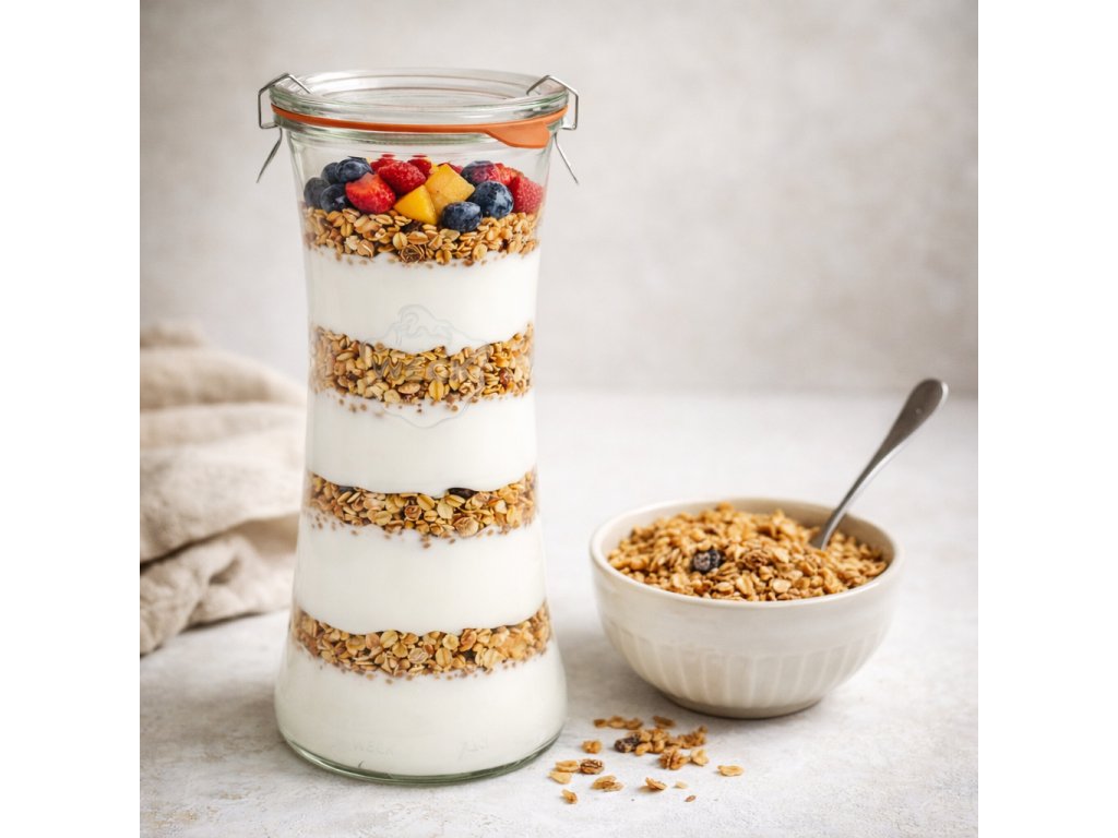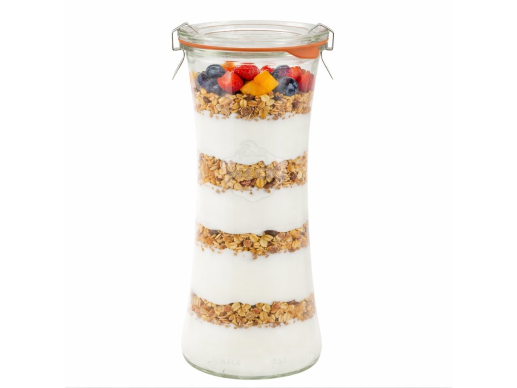 Sklenice karafa Jojo velká 700 ml od značky WECK je ideální pro servírování ovocných nápojů, tekutých jogurtů, polévek či domácích likérů. Díky průměru hrdla 80 mm je plnění a čištění sklenice snadné a pohodlné. Každá sklenice je dodávána se skleněným víčkem, těsnicí gumičkou a dvěma nerezovými klipsy, což zajišťuje bezpečné a spolehlivé uzavření. Objem sklenice je 700 ml, přičemž pojme přibližně 670 ml tekutiny. Sklenice WECK jsou známé svou vysokou kvalitou a dlouhou tradicí, což je činí oblíbenou volbou pro domácí i profesionální zavařování.
