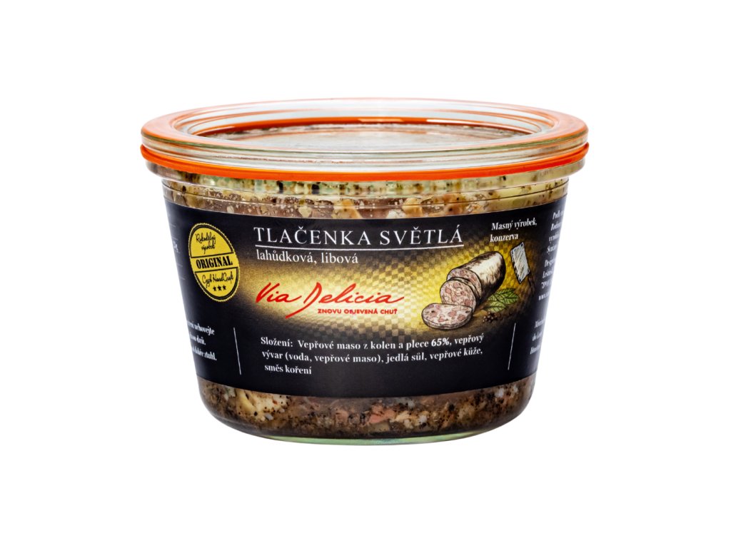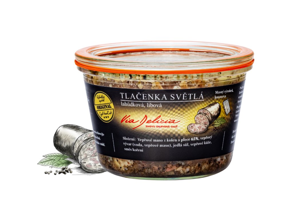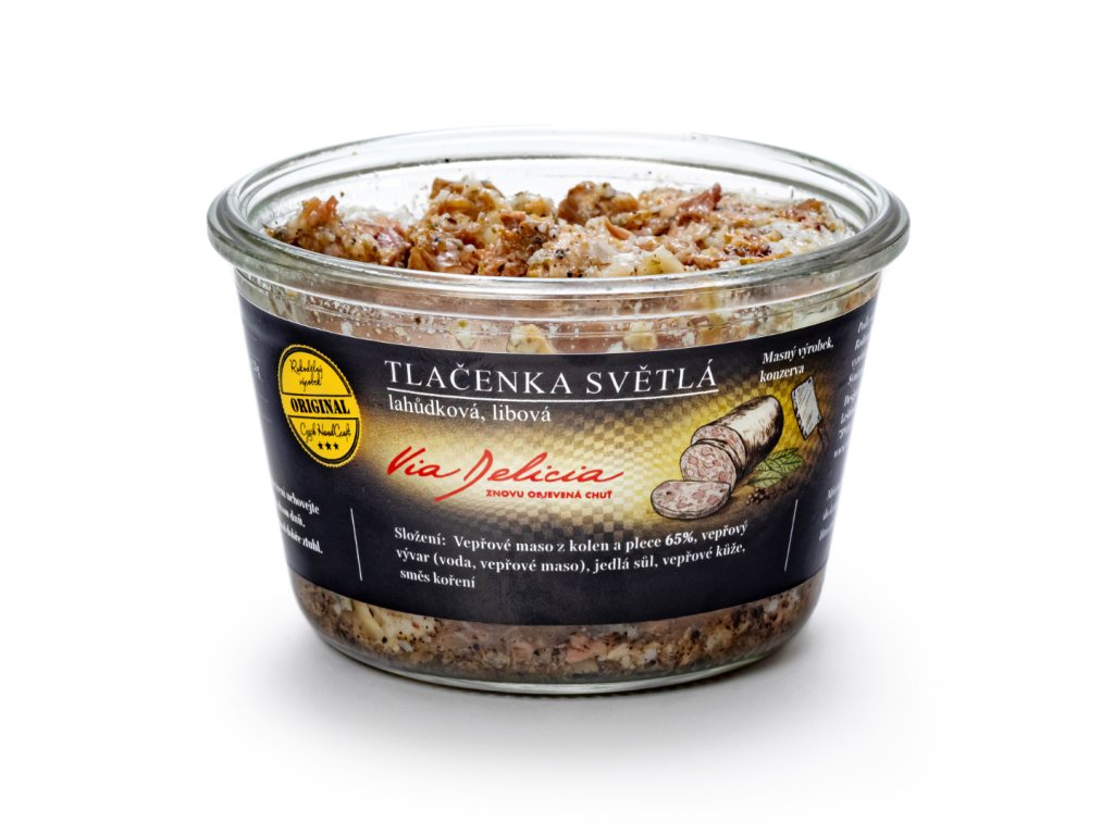 Tato světlá tlačenka obsahuje 65 % libového masa z kolen a plece, zalitého vývarem a doplněného vepřovou kůží. Je jemně kořeněná a bez zbytečných přísad. Vyniká čistou chutí, kterou ocení každý, kdo má rád klasiku v moderním pojetí. Výborně se hodí k cibuli, octu a pečivu, ale skvěle chutná i samotná – ideální jako předkrm nebo večerní pochoutka. Před servírováním doporučujeme vychladit, aby krásně ztuhla.